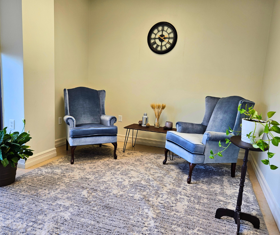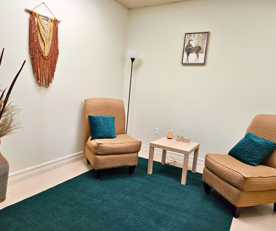 Our meeting room is designed for meaningful one-to-one work in a calm, welcoming environment. It’s a comfortable space that supports conversation, connection, and focused sessions.