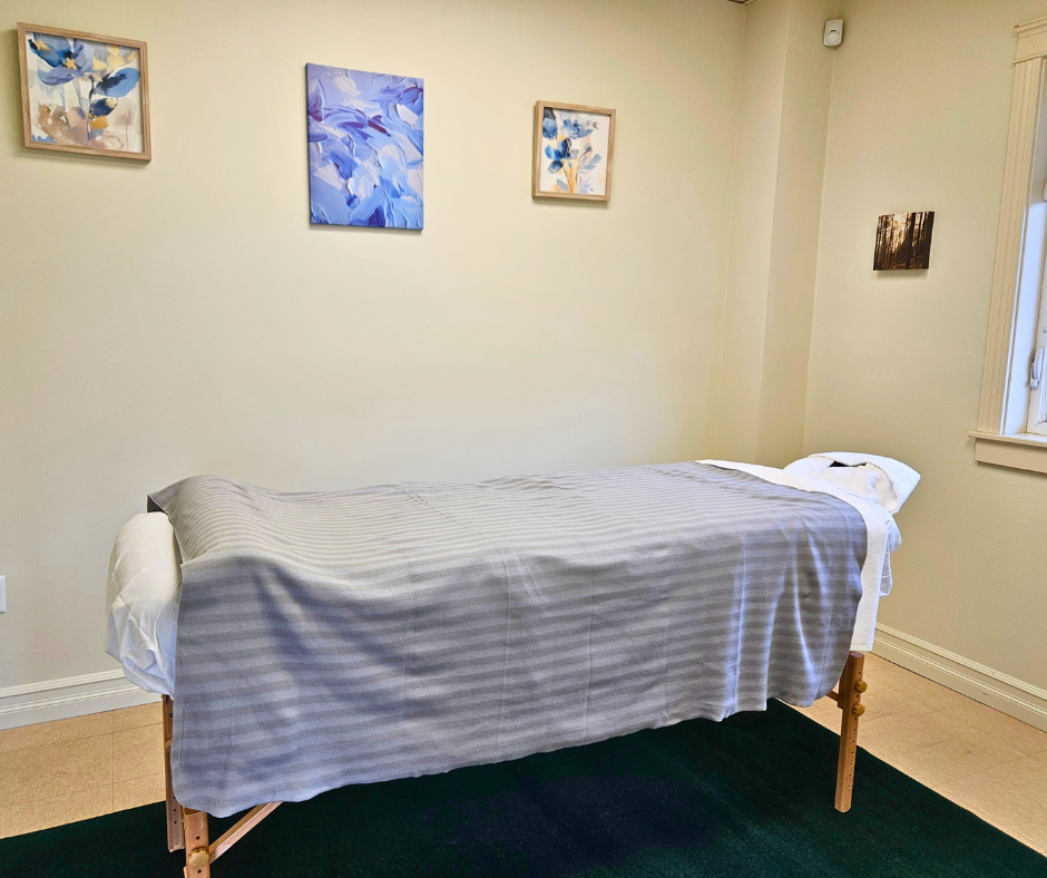 Our therapy room is a private, professional space designed to support hands-on and restorative wellness services. It features a full massage bed, making it ideal for practitioners offering body-based or energy-focused sessions.